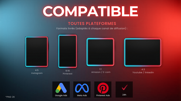 Absolument. Les packshots ambiance sont livrés aux formats exacts requis par Meta (4:5, 1:1, 9:16) selon le pack choisi.