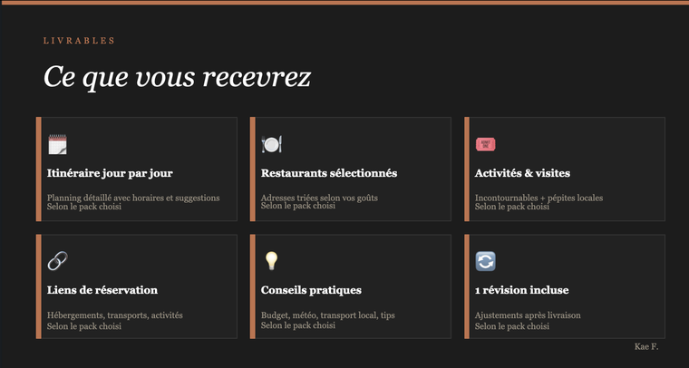 Du city-trip dynamique au road-trip sauvage, vous recevez un carnet de route (PDF interactif) clair et prêt à l'emploi.