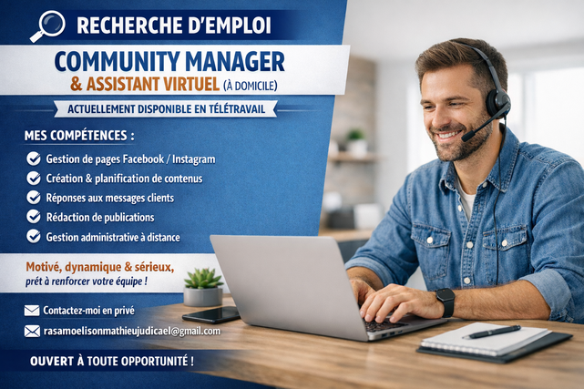 Je suis actuellement à la recherche d’un poste en Community Manager (gestion de page Facebook/Instagram) ou Assistant Virtuel, en télétravail (à domicile, non présentiel).
