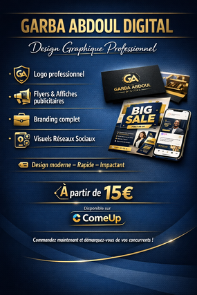 👋 Bonjour, je suis Garba Abdoul, designer graphique spécialisé en communication visuelle professionnelle. 🎨 Je vous aide à développer votre image avec : ✔ Flyers & Affiches publicitaires ✔ Branding complet ✔ Designs réseaux sociaux professionnels 🚀 Mon objectif : vous aider à attirer plus de clients grâce à des visuels modernes et impactants. ✅ Travail sérieux ✅ Communication rapide ✅ Respect des délais ✅ Satisfaction client prioritaire Prêt à booster votre image ? Contactez-moi maintenant.