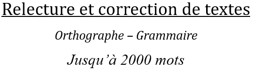 Je vous propose ce service de relecture et correction (orthographe et grammaire) de textes courts jusqu'à 2000 mots à 17,53 $US avec un délai de 3 jours maximum.