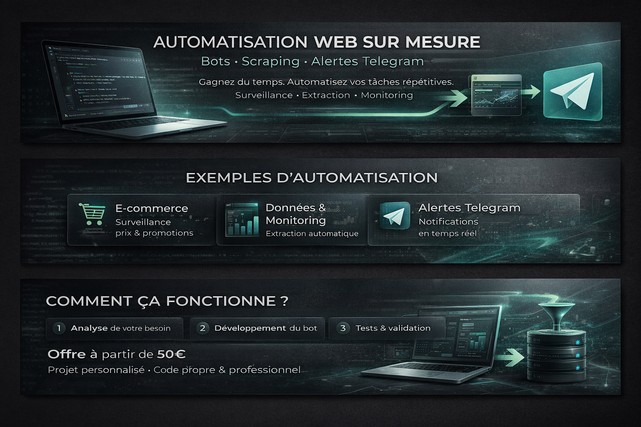 Je développe pour vous un système d’automatisation web intelligent capable de naviguer comme un humain, se connecter à un site si nécessaire, extraire des informations précises (produits, prix, promotions, données dynamiques…) et vous envoyer les résultats automatiquement via Telegram, email ou autre canal.