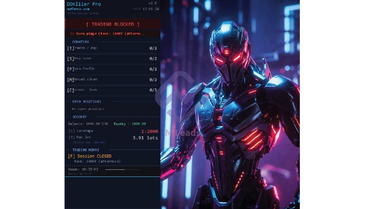 *DDKillerPro est un expert advisor surveille ton compte en temps réel et bloque automatiquement tout nouveau trade dès qu'une limite est atteinte — drawdown journalier, nombre de trades, série perdante ou plage horaire dépassée.