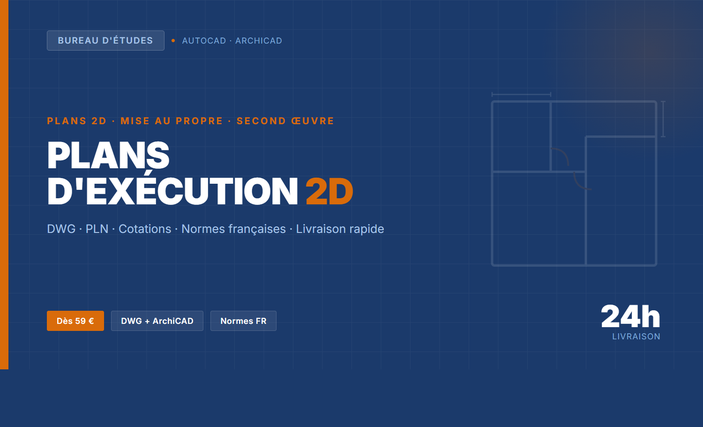 Mon expérience en bureau d'études spécialisé second œuvre est le socle de ce que je produis. La mise au propre de plans 2D, c'est une pratique réelle — pas une prestation occasionnelle.