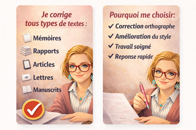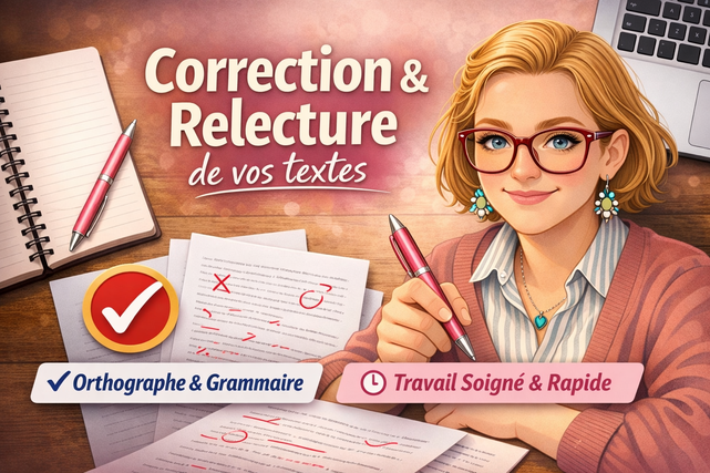 Bonjour et bienvenue ! 🌸 Je suis formée dans le domaine littéraire et je mets ma passion pour les mots à votre service. Je propose un accompagnement complet pour la relecture, la correction et l’amélioration de tous vos textes : mémoires, rapports, manuscrits, articles… Mon approche est douce et attentive : je respecte votre style tout en veillant à la clarté, la cohérence et l’impact de vos écrits. Chaque texte est traité avec soin pour qu’il reflète exactement ce que vous voulez exprimer. Je peux vous aider à : • Corriger l’orthographe, la grammaire et la syntaxe • Améliorer le style et la fluidité • Structurer et clarifier vos idées • Adapter le ton à votre public Que vous soyez étudiant, professionnel ou auteur, je suis là pour vous accompagner et faire briller vos textes. 🌟 Emma GB
