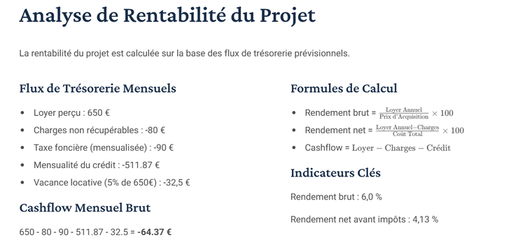 À partir des informations que vous me transmettez, j’analyse la cohérence financière du projet, l’impact sur votre taux d’endettement et la solidité globale de l’opération. L’ensemble est organisé dans un document clair et structuré, prêt à être présenté à votre banque.