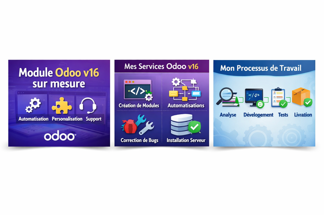 Si votre besoin est plus avancé, vous pouvez choisir une offre supérieure ou ajouter des options. Je peux créer un module personnalisé complet, automatiser vos processus métier, intégrer une API externe ou optimiser les performances de votre instance Odoo. Je peux également installer le module sur votre serveur, fournir une documentation utilisateur ou assurer un support après livraison.