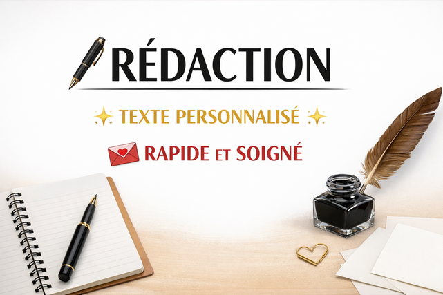 Je vous propose un service de rédaction personnalisé, réalisé avec soin et adapté à votre demande. Chaque texte est unique et écrit pour transmettre clairement vos émotions ou votre message. Que ce soit pour un message d’amour, d’anniversaire ou un texte particulier, je m’applique à trouver les mots justes pour vous satisfaire rapidement et efficacement.