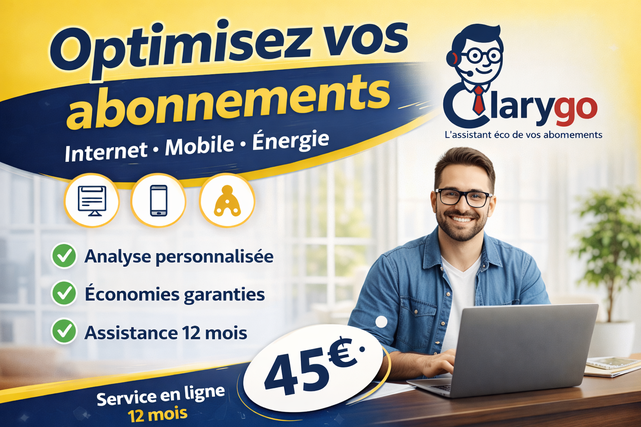 Clarygo est un service indépendant de conciergerie administrative accompagnant les particuliers dans la gestion de leurs abonnements (internet, mobile, énergie). Nous ne vendons pas d’abonnements, ne fournissons aucun service d’accès, n’agissons pas en tant que courtier ou comparateur et ne manipulons aucun fonds client.