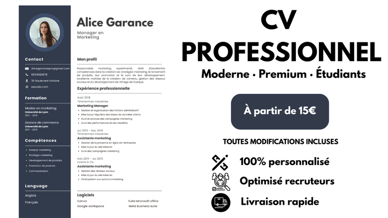 J'ai réalisé des études en création et design de support digitaux. Cela est plus qu'une simple activité pour moi, c'est une vocation. Je crée pour vous un CV professionnel 100% personnalisé selon votre demande. J'adapte ma création en fonction de votre profil et vos objectifs (stage, emploi, alternance).