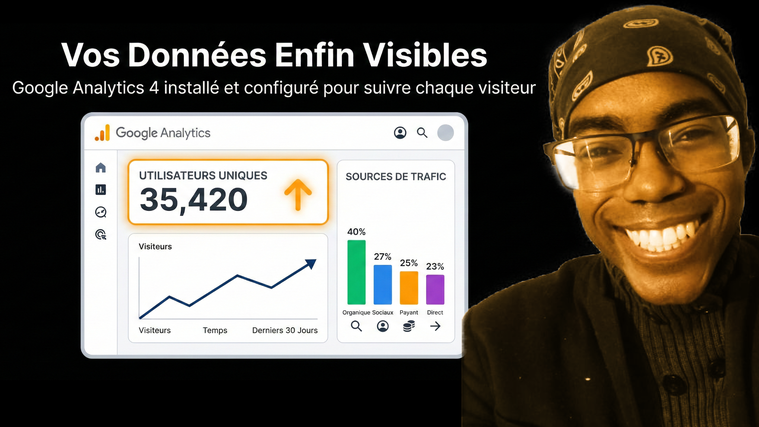 Je m'appelle Josué Diagathe, fondateur de 001marketing. Depuis 2017, j'installe Google Analytics sur chaque site client. C'est le premier outil que je connecte après la mise en ligne — parce qu'un site sans analytics, c'est un avion sans instruments de bord.