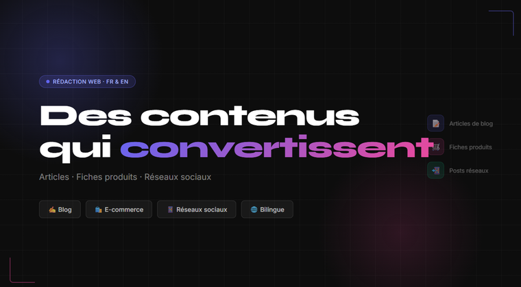 Moi je m'en charge. Vous m'expliquez ce que vous voulez, je vous écris quelque chose de propre et de lisible, en français ou en anglais. Pas de jargon inutile, pas de remplissage. Juste un texte qui fait le job.