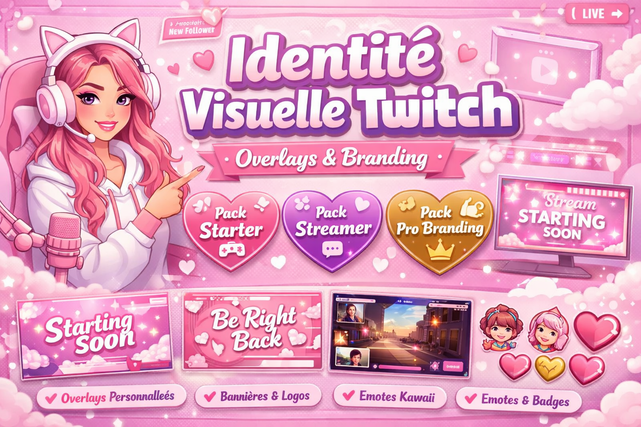 Je crée une identité visuelle cohérente et des overlays Twitch sur-mesure (style gaming, chill, e-sport, rétro, minimaliste, etc.) pour que ton stream soit reconnaissable et clean.