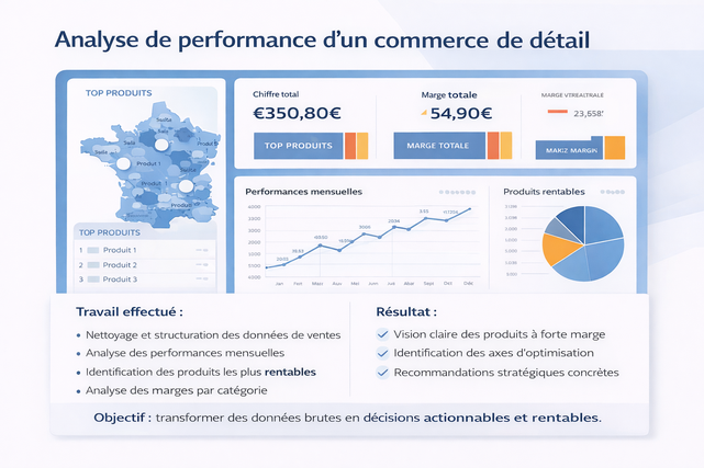 Vous avez des données mais vous ne savez pas quoi en faire ? Dirigeant depuis plus de 15 ans, j’aide les indépendants et petites entreprises à analyser leurs chiffres pour prendre de meilleures décisions. Je peux vous aider à : • Nettoyer et structurer vos fichiers Excel • Créer des tableaux de bord clairs • Analyser vos ventes et votre rentabilité • Identifier des axes d’amélioration concrets Approche simple, pragmatique et orientée résultats. Objectif : vous donner une vision claire et exploitable de votre activité.