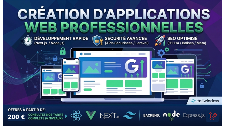 Je construis des applications web modernes, performantes et sécurisées avec les technologies les plus récentes. Chaque projet est pensé pour être rapide, fiable et visible sur Google, afin de maximiser votre impact en ligne.