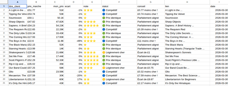 • Pack Automatisation (Expert) : Création d'un workflow automatisé (via n8n) mettant à jour vos prix en temps réel dans un Dashboard Google Sheets.