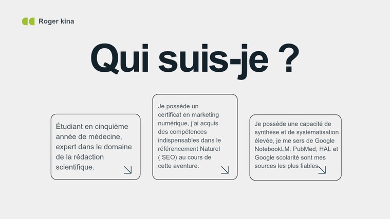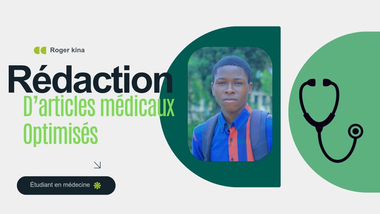 Je m’appelle Roger kina, étudiant en cinquième année de médecine ; je suis rédacteur Web SEO, j’ai un certificat en marketing numérique, j’ai suivi de nombreuses formations dans le domaine médical..