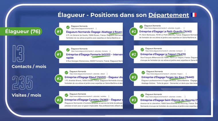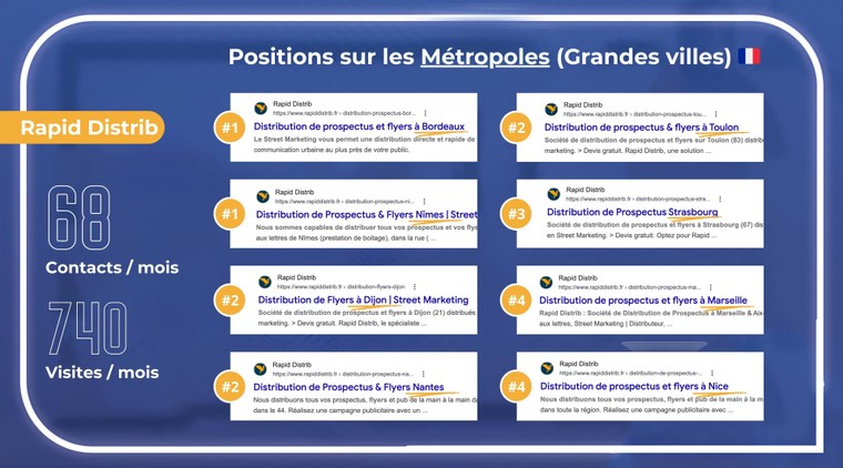 Je vous remercie. Je suis ravi de savoir que la prestation a été appréciée. Effectivement le travail effectué a été au delà des attentes. Nous avons pu avoir un positionnement en première page sur la majorité des métropoles. Je reste à votre entière disposition pour d'éventuels projets à l'avenir. Bien cordialement !