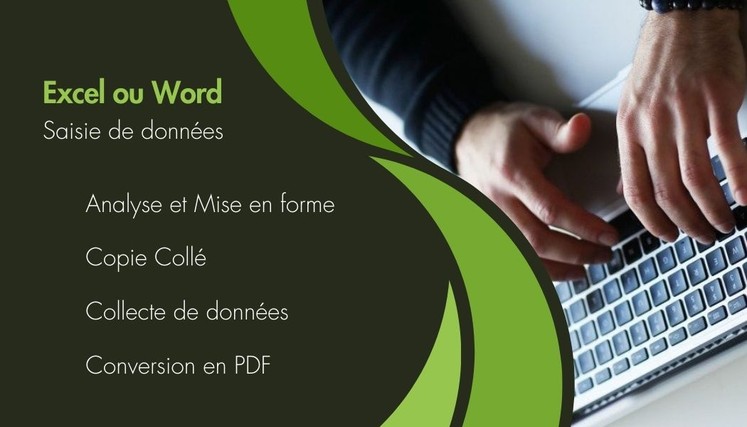 Bonjour 👋 Vous cherchez une personne sérieuse et efficace pour réaliser vos travaux de saisie de données ? Je suis Elie, spécialisé dans la saisie et l’organisation de données. 🎯 Mon objectif est de vous fournir un travail propre, structuré et précis afin de vous faire gagner du temps. 📊 Saisie de données – Saisie rapide et précise – Copie de données PDF vers Excel ou Word – Organisation et classement de données – Mise en forme de tableaux – Automatisation de tâche avec VBA – Recherche et collecte d’informations Je veille à ce que chaque information soit correctement saisie et organisée. 🚀 Pourquoi travailler avec moi ? ✔ Travail précis ✔ Respect des délais ✔ Sérieux et rigoureux ✔ Communication rapide ✔ Satisfaction client prioritaire 💰 Offre de base : 10€ Pour 10€, je réalise une tâche de saisie définie ensemble selon votre besoin. Des options sont disponibles selon le volume de données.
