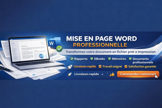 Votre document manque de structure et d’impact visuel ? Je transforme vos rapports, eBooks, mémoires et documents professionnels en supports clairs, harmonisés et prêts à impression. ✔ Mise en page Word professionnelle ✔ Design graphique structuré ✔ Table des matières automatique ✔ Images alignées et optimisées ✔ Document prêt à export PDF 🎯 Résultat : plus de crédibilité, plus d’impact, une image professionnelle renforcée. Réactif, sérieux et respect des délais. 📩 Commandez maintenant chez nous et donnez une image professionnelle à votre document et votre propre marque.