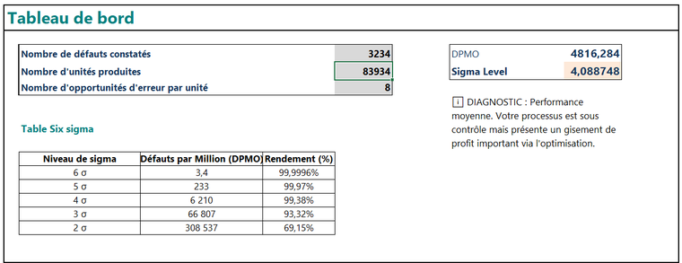 Dashboard Automatique : Saisissez vos données, obtenez votre Sigma Level et votre DPMO instantanément.