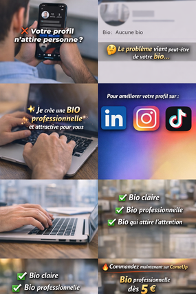 Je vais rédiger pour vous une bio professionnelle, claire et attractive qui mettra en valeur votre profil et votre activité. Mon objectif est de vous aider à présenter votre personnalité, vos compétences ou votre activité de manière simple mais efficace.