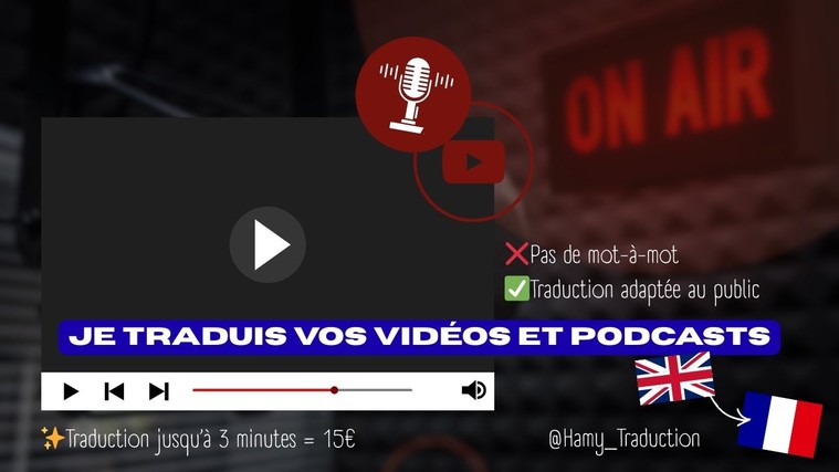 Proposé par Hamy_Traduction •🌍Traductions 🔈➡️🗒️Transcriptions pour vos vidéos YouTube et podcasts Vente au total 0