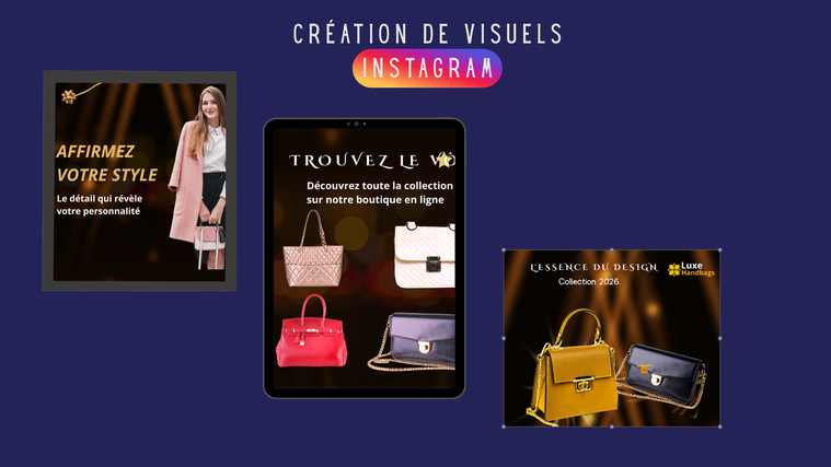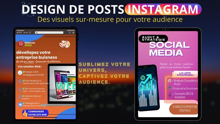 Un concentré de graphisme Instagram ciblé sur l'essentiel (cette offre n'inclut pas de grille/feed complexe, de carrousels ou de Highlights).