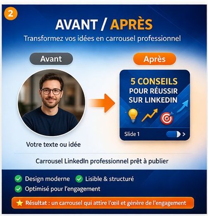 Si vous avez déjà du contenu (article, post, idée, vidéo ou podcast), je vais le transformer en un carrousel LinkedIn professionnel et attractif.