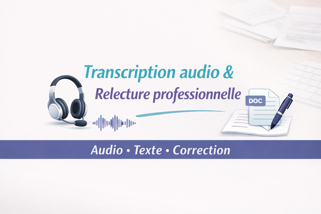 Pour la transcription, j’écoute vos audios ou vidéos et je les transforme en texte clair, corrigé et bien structuré.