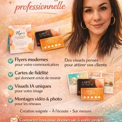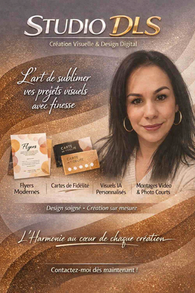Je suis Lilas, fondatrice de Studio DLS, créatrice passionnée, motivée. Je me relance dans la vie active pour me prouver qu’on peut être parent, passionnée et professionnelle à la fois. Je propose des services soignés et accessibles : ✔ Flyers modernes ✔ Cartes de fidélité attractives ✔ Visuels IA personnalisés ✔ Petits montages vidéo et photo Je travaille avec sérieux, précision et sens du détail. Chaque projet est réalisé avec engagement et une vraie volonté d’offrir un résultat propre, harmonieux et adapté aux besoins de mes clients. Studio-DLS, c’est un petit studio qui met du cœur dans chaque création. Si vous cherchez quelqu’un de motivé, sincère et impliqué, je serai ravie de donner vie à vos idées.
