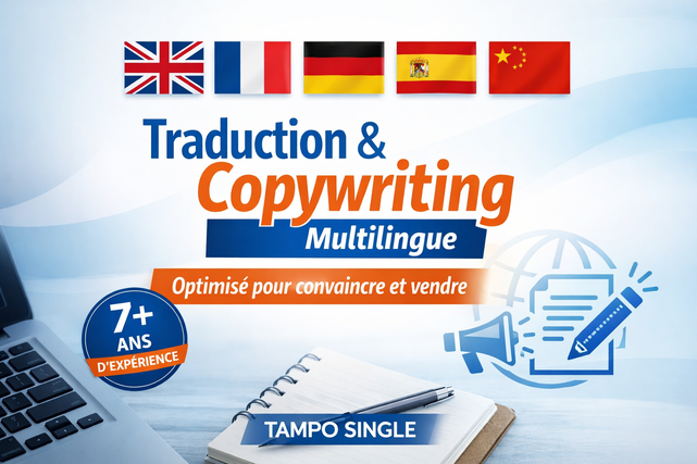 Bonjour ! Je suis Tampo SINGLE, traducteur et copywriter multilingue avec plus de 7 ans d’expérience. Je propose des services de traduction et de rédaction professionnelle qui vont bien au-delà de la simple traduction : vos textes seront adaptés et optimisés pour convaincre et vendre dans plusieurs langues, notamment anglais, français, allemand, espagnol et chinois.