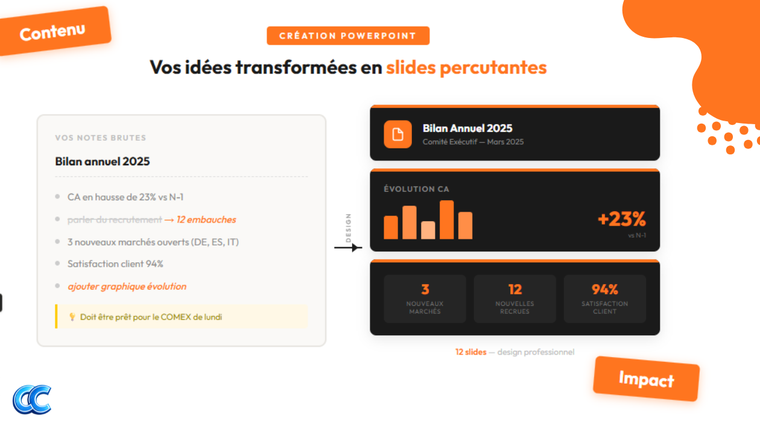 💡 Vous n'avez pas de contenu structuré ? Pas de problème. Envoyez-moi vos notes brutes, vos idées en vrac ou même un simple brief oral, et je me charge de structurer le tout en une présentation cohérente et logique.
