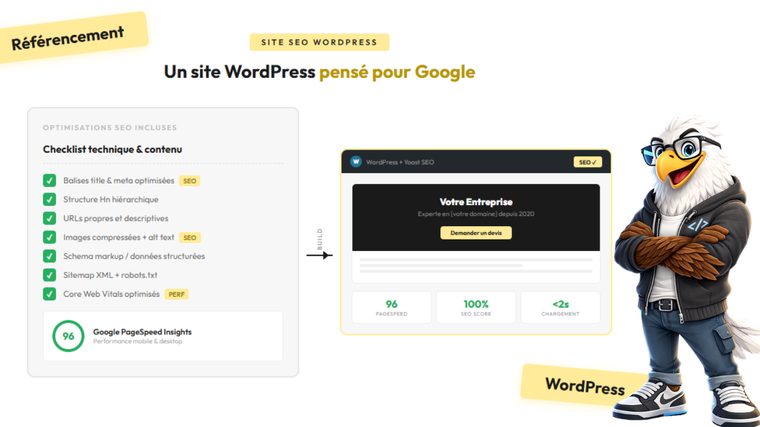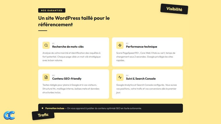 L'offre de base correspond à la création d'un site web SEO avec WordPress au format landing page / one page. Elle convient parfaitement si vous voulez une présence en ligne professionnelle, claire et déjà pensée pour convertir vos visiteurs.