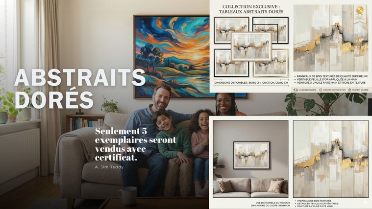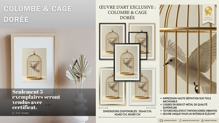 3 modèles uniques : "Marbre & Veines d'Or", "Tableaux Abstraits Dorés" et "Colombe & Cage Dorée".