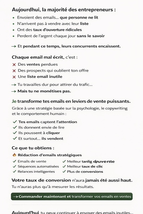 portfolio : https://yannlegall.eu/ À propos de moi Depuis plusieurs années, je suis fasciné par une question simple qui fait toute la différence dans le business : Pourquoi certains produits se vendent comme des petits pains… alors que d’autres, parfois meilleurs, ne vendent presque rien ? La réponse tient souvent en un seul mot : Le copywriting. Les mots que vous utilisez peuvent transformer un simple visiteur en client. Ils peuvent déclencher une émotion, créer un désir, lever une objection… et pousser quelqu’un à passer à l’action. Mais la plupart des entreprises commettent toujours la même erreur : elles parlent de leur produit, de leurs fonctionnalités, de leur entreprise… sans jamais vraiment parler du client. Et pourtant, dans l’esprit d’un acheteur, une seule chose compte : “Qu’est-ce que ça change pour moi ?” C’est exactement là que mon travail commence. Je suis copywriter spécialisé dans la rédaction de contenus marketing conçus pour attirer l’attention, captiver le lecteur et transformer les visiteurs en clients. Mon approche ne consiste pas simplement à écrire des textes. Je construis des structures de persuasion complètes, pensées pour guider le lecteur étape par étape vers une décision d’achat. Chaque projet commence par une phase essentielle : comprendre profondément votre marché et votre client idéal. Car une page de vente performante ne repose pas uniquement sur de belles phrases. Elle repose sur une compréhension précise de la psychologie humaine. Je m’intéresse donc à tout ce qui influence une décision d’achat : les frustrations du client, ses désirs, ses objections, ses peurs, ses motivations profondes. À partir de là, je construis un message qui parle directement à lui. Un message qui capte son attention, crée une connexion et lui donne envie d’aller plus loin. Pour cela, j’utilise différentes techniques de copywriting et de persuasion issues du marketing direct, comme la structure AIDA, le storytelling stratégique, ou encore les déclencheurs psychologiques qui influencent la prise de décision. Mais au-delà des techniques, ce qui fait vraiment la différence, c’est la stratégie. Un bon copywriter ne se contente pas d’écrire. Il réfléchit à la manière dont chaque mot va influencer le comportement du lecteur. Comment attirer son attention. Comment maintenir son intérêt. Comment transformer sa curiosité en désir. Et enfin, comment l’amener à passer à l’action. C’est cette logique qui guide mon travail. Je vois chaque page de vente comme une machine de conversion. Un système conçu pour transformer le trafic en clients. Dans un monde où l’attention est devenue une ressource rare, savoir communiquer efficacement est devenu un avantage énorme. Les entreprises qui maîtrisent le copywriting ne se contentent pas de vendre un produit. Elles racontent une histoire. Elles créent une vision. Elles donnent à leurs clients une raison de croire en leur solution. C’est cette approche que j’applique dans chacun de mes projets. Mon objectif est simple : aider les entrepreneurs, les créateurs et les entreprises à mettre les bons mots sur la valeur réelle de leur offre. Parce que lorsqu’un message est clair, puissant et aligné avec les besoins du client, les ventes suivent naturellement. Aujourd’hui, je mets mes compétences au service de ceux qui veulent faire passer leur communication au niveau supérieur. Si vous avez un produit, un service ou une idée qui mérite d’être mieux présentée et mieux vendue, je serai ravi de vous aider à construire un message qui fera la différence. Après tout, dans le marketing comme dans la vente, une chose reste vraie : les mots peuvent tout changer. Suivez le lapin blanc : yann le gallportfolio