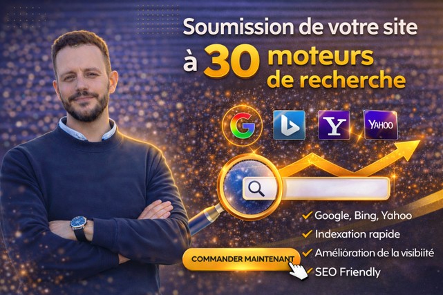 Je vais soumettre votre site à 30 moteurs de recherche afin d’améliorer vos chances d’indexation, de renforcer votre présence SEO et de poser une base propre pour votre référencement.