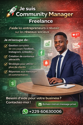 ~ ~ Je suis Augustin Dossou, spécialiste en e-commerce et marketing digital, passionné par la création de stratégies qui transforment les idées en revenus. J’accompagne les entrepreneurs, entreprises et particuliers dans le développement de leur visibilité en ligne, la création de contenus attractifs et l’optimisation de leurs ventes sur internet. Grâce à mes compétences en création de contenu, gestion des réseaux sociaux, rédaction marketing et outils d’intelligence artificielle, je propose des solutions modernes, efficaces et adaptées aux besoins de chaque client. Mon objectif est simple : vous aider à gagner du temps, attirer plus de clients et augmenter vos résultats. Sérieux, créatif et réactif, je suis prêt à collaborer avec vous pour faire évoluer votre projet.