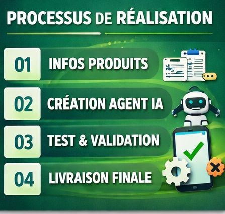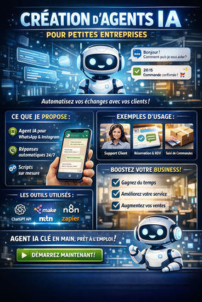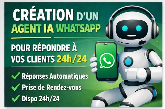 Je crée pour vous **un agent IA WhatsApp personnalisé** qui s’occupe de vos clients **24h/24 et 7j/7**.