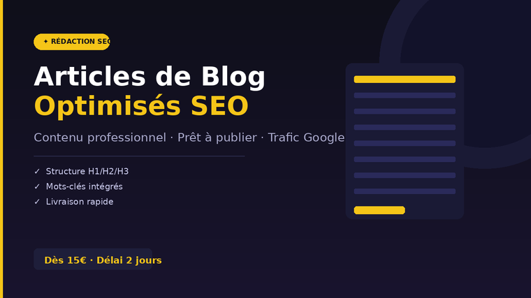 Je suis spécialisé dans la rédaction d'articles de blog optimisés pour le référencement naturel (SEO). Mon objectif : vous livrer un contenu professionnel, prêt à publier, qui attire du trafic qualifié sur votre site.