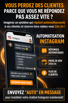 Je vous propose de mettre en place une automatisation professionnelle de vos messages Instagram afin de répondre automatiquement à vos clients et prospects. Grâce à un chatbot configuré, votre compte pourra envoyer des réponses automatiques, qualifier les prospects et orienter les clients vers vos services.