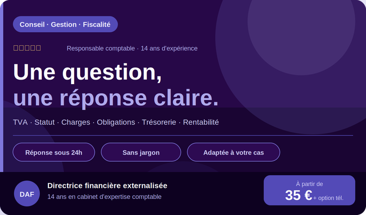 Une question précise sur la TVA, vos obligations, votre statut ou vos chiffres ? Je vous réponds par écrit de façon claire et actionnable. Plus de 10 ans d'expérience en cabinet d'expertise comptable : comptabilité, fiscalité, droit des sociétés, créations et liquidations d'entreprises, bilans, contrôles fiscaux ... Directrice financière externalisée pour TPE - PME