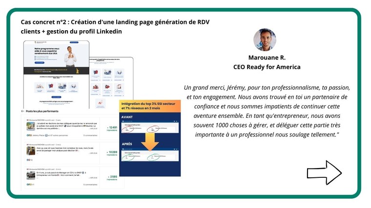 Le coéquipier que vous cherchez pour tous vos projets marketing et ventes. Bonjour, Je suis Jérémy, votre responsable-coéquipier marketing externalisé . J'interviens dans votre business pour mettre en place des actions utiles et rentables : 1️⃣ Analyser votre situation et définir la stratégie 2️⃣ Piloter les actions de marketing terrain et de marketing digital 3️⃣ Exécuter et déployer les actions définies ✅10 ans d'expérience en vente et marketing ✅Déjà 3 ans d'expérience freelance marketing ✅Equipe réduite pour les missions globales (>3 mois) ✅ Satisfaction à 100%, retouches illimitées ✅Nouveau sur ComeUp Travailler avec moi, c'est : Bénéficier d'une expertise avant-tout commerciale dans le but de créer des actions marketing utiles et rentables. Se doter d'un partenaire capable d'intervenir sur la** stratégie globale, le pilotage et l'éxécution** Créer une relation de confiance, pérenne, sur le long terme qui sert votre développement. 🏋️Accompagnement particulièrement adapté pour : Les solopreneurs qui ont besoin de déléguer l'aspect marketing de leur business à un~ intermédiaire de confiance~. Les entrepreneurs / chefs d'entreprise qui ont besoin d'un partenaire marketing temporaire pour (re)structurer leur présence sur le terrain ou en ligne. Les services marketing qui ont besoin d'un renfort ponctuel pour faire avancer un ou plusieurs projets en cours. Mes secteurs de prédilection : 🏠 Immobilier - Construction - Financement 🧑🎓 Education 🚲 Services BtoC / BtoB 🏪 Commerces BtoC 🍇 Restauration - Wine J'étudie toutes propositions et j'aime travailler pour développer des services/produits en lesquels je crois. Je saurai être franc sur ma capacité à vous accompagner selon ce pour quoi vous me sollicitez. Contactez-moi pour en discuter. Mes dernières missions marketing et en cours : **👉 Accompagnement d'une école de langue à Paris sur 12 mois : ** Conseils sur la stratégie d'acquisition-conversion Redefinir les parcours d'inscription des apprenants Redesign et copywriting du site web (+ 30 pages) Restructuration des campagnes emails et création d'une newsletter bi-mensuelle Création d'un lead magnet (catalogue formation) Création des miniatures et publicités sur les réseaux sociaux Résultats : Des prospects mieux qualifiés car mieux informés au moment de la prise de contact par le service commercial Des élèves plus confiants de part la qualité et la clarté du site web Un cycle de vente plus rapide Des inscriptions plus nombreuses dans le parcours complet (meilleure rentabilité pour l'école). 👉 Rédaction d'articles sport pour une agence médias : Production régulière de 80 à 100 articles par mois pour des médias à forte audience Articles de 300 à 600 mots, adaptés à la consommation mobile CANAL+, Le Parisien, Sports.fr, Capital, Téléloisirs... Type de contenus : articles programme TV sport / actualité football / compétitions européennes / contenus orientés acquisition et affiliation -- 🖱️Mes outils de prédilection : Salesforce / HubSpot Google Analytics / Google Search Console Semrush / Ahref WordPress / Squarespace / Wix / Systeme.io Canva CapCut ChatGPT / Midjourney / Gemini / Perplexity 📞 CONTACTEZ-MOI GRATUITEMENT SUR COMEUP POUR DEMARRER