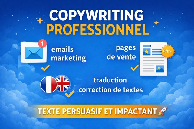 Je suis copywriter spécialisé en email marketing et en rédaction de pages de vente. J’aide les entrepreneurs, marques et créateurs à transformer leurs prospects en clients grâce à des textes stratégiques et persuasifs. Je peux vous aider à : -Traduis vos textes français – anglais -Corrige vos textes en français rédiger des emails marketing qui captent l’attention et génèrent des clics créer des séquences d’emails pour vendre vos produits ou services écrire des pages de vente claires, convaincantes et orientées conversion Mon objectif est simple : vous aider à augmenter vos ventes grâce à un copywriting efficace. Je travaille avec sérieux, respect des délais et une vraie attention aux objectifs de votre projet. Si vous cherchez un copywriter pour améliorer vos emails ou votre page de vente, vous êtes au bon endroit.