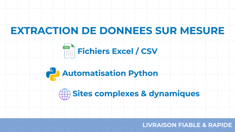 Je développe des scripts d’extraction en Python capables de collecter automatiquement des données depuis des sites web et de les transformer en fichiers propres et exploitables.