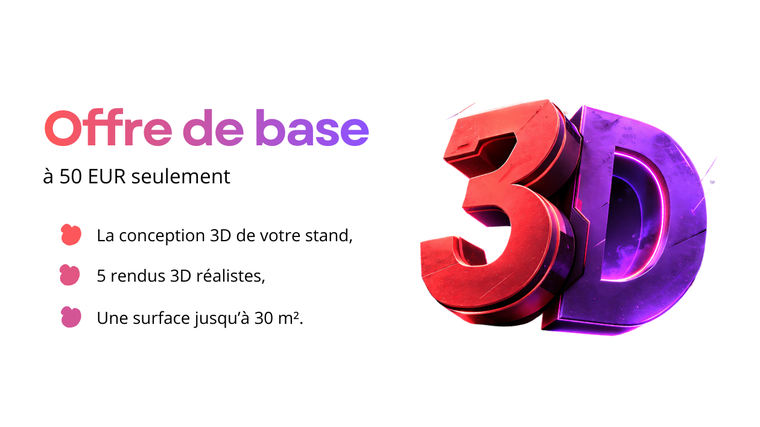 - Conception 3D professionnelle de votre stand avec des rendus réalistes de haute qualité