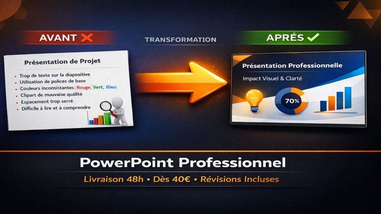 Expert PowerPoint 230+ projets livrés Livraison 48h garantie