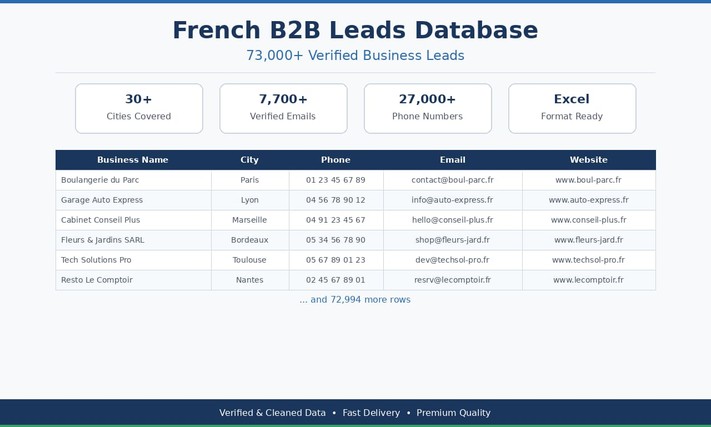 🎯 Expert en génération de leads B2B & fichiers de prospection qualifiés. Ce que je propose : 📊 Des bases de données d'entreprises françaises vérifiées, prêtes à l'emploi pour votre prospection téléphonique, emailing ou terrain. 💎 Mes atouts : ✅ +70 000 leads en stock (28 villes, 20+ secteurs) ✅ Téléphones vérifiés au format +33 ✅ Emails professionnels scrapés depuis les sites web ✅ Fichiers Excel premium avec score qualité et filtres ✅ Données fraîches, mises à jour régulièrement 🏙️ Paris, Lyon, Marseille, Bordeaux, Lille, Toulouse, Nice, Nantes, Strasbourg, Montpellier... 🏢 Restaurants, garages, avocats, dentistes, médecins, coiffeurs, pharmacies, hôtels, bars, boulangeries... ⚡️ Livraison immédiate — Échantillon gratuit sur demande 🔄 Service récurrent disponible : leads frais chaque mois