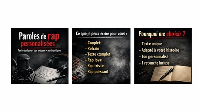 Tu ressens quelque chose de fort mais tu ne sais pas comment le mettre en mots ? C’est exactement là que j’interviens. Je t’écris un texte unique, profond et authentique, adapté à ton histoire et à l’émotion que tu veux transmettre. Chaque texte est écrit avec soin pour toucher vraiment la personne à qui il est destiné. ✍️ Je peux écrire pour toi : • Texte de rap personnalisé • Message d’amour intense • Lettre émouvante • Message d’excuse ou de réconciliation • Texte pour anniversaire ou occasion spéciale • Message père / fille, mère / enfant, ami, couple • Texte inspirant ou profond 💡 Comment ça se passe : 1️⃣ Tu m’expliques la situation et l’émotion à transmettre 2️⃣ Tu me donnes quelques détails sur la personne 3️⃣ Je crée un texte sur mesure, sincère et impactant 🔥 Mon objectif : Que la personne qui lit ton message ressente réellement l’émotion derrière les mots. Chaque texte est 100 % original, jamais copié, et écrit spécialement pour toi. 📩 Tu peux aussi m’envoyer un message avant de commander si tu as une demande particulière. “Réponse rapide – livraison possible en 24h.”