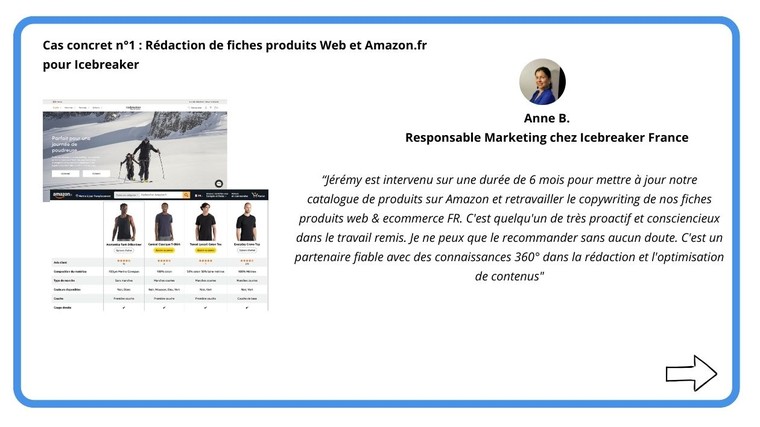 J’ai notamment travaillé pour une marque néo-zélandaise de sport outdoor spécialisée dans les vêtements en laine de mérinos, pour laquelle j’avais pour mission d’implémenter et optimiser le catalogue produit sur Amazon.